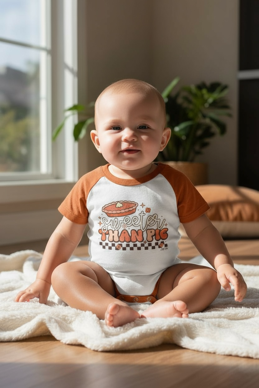 Celebrate Thanksgiving in style with the "Sweeter Than Pie" baseball onesie. Crafted for comfort and festive fun, this onesie combines sporty charm with holiday spirit, making it perfect for little fans to wear during family gatherings or photo sessions. Add a playful touch to your holiday wardrobe with this unique and adorable outfit.
